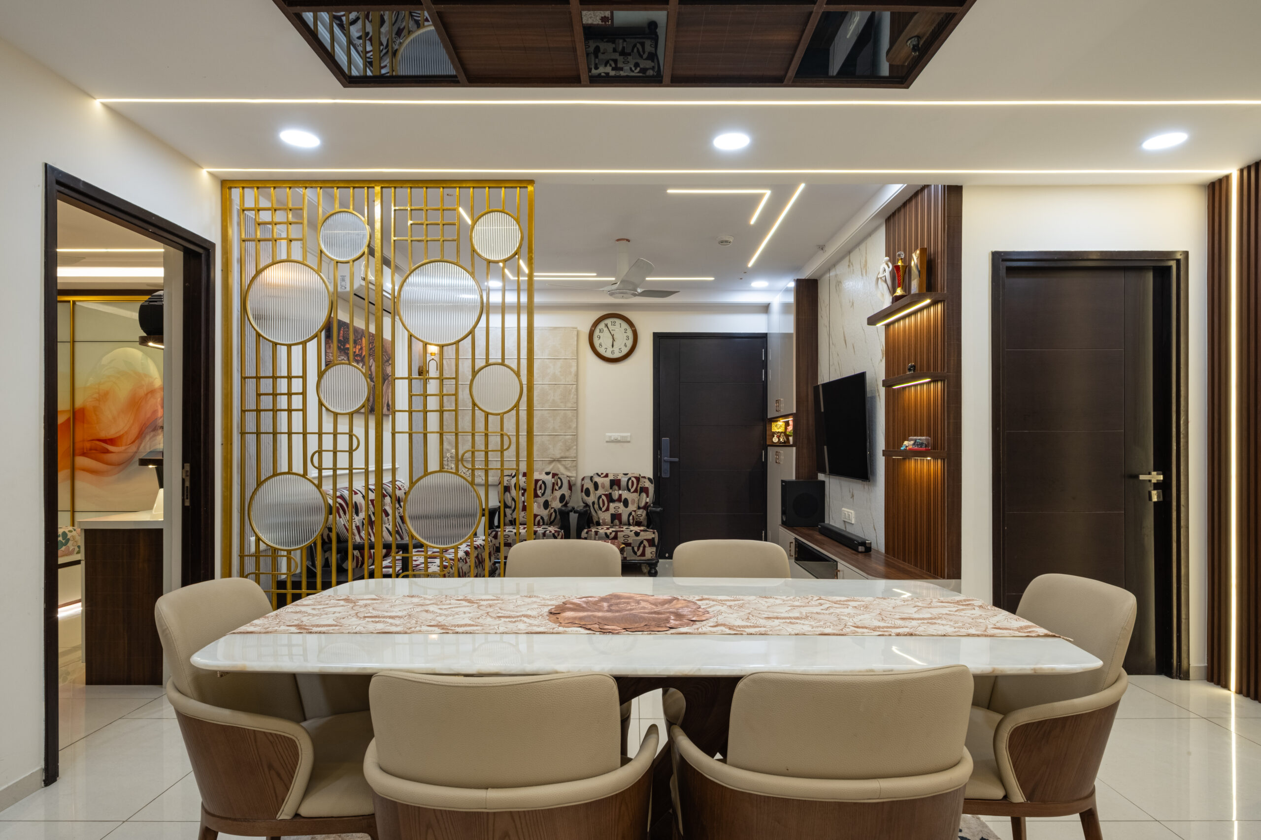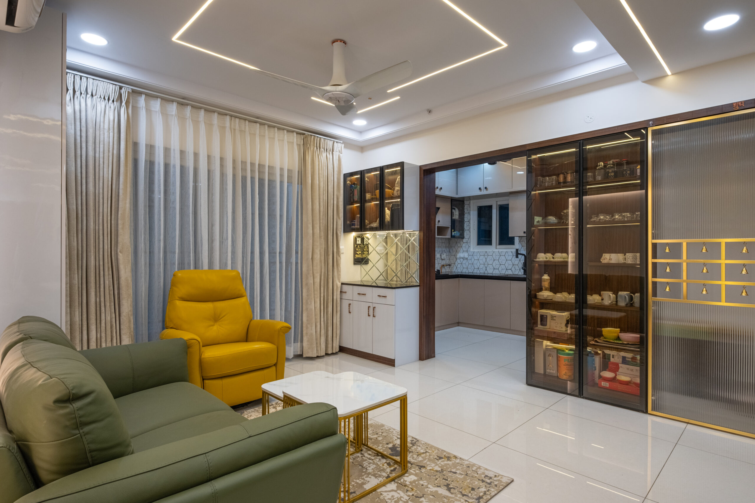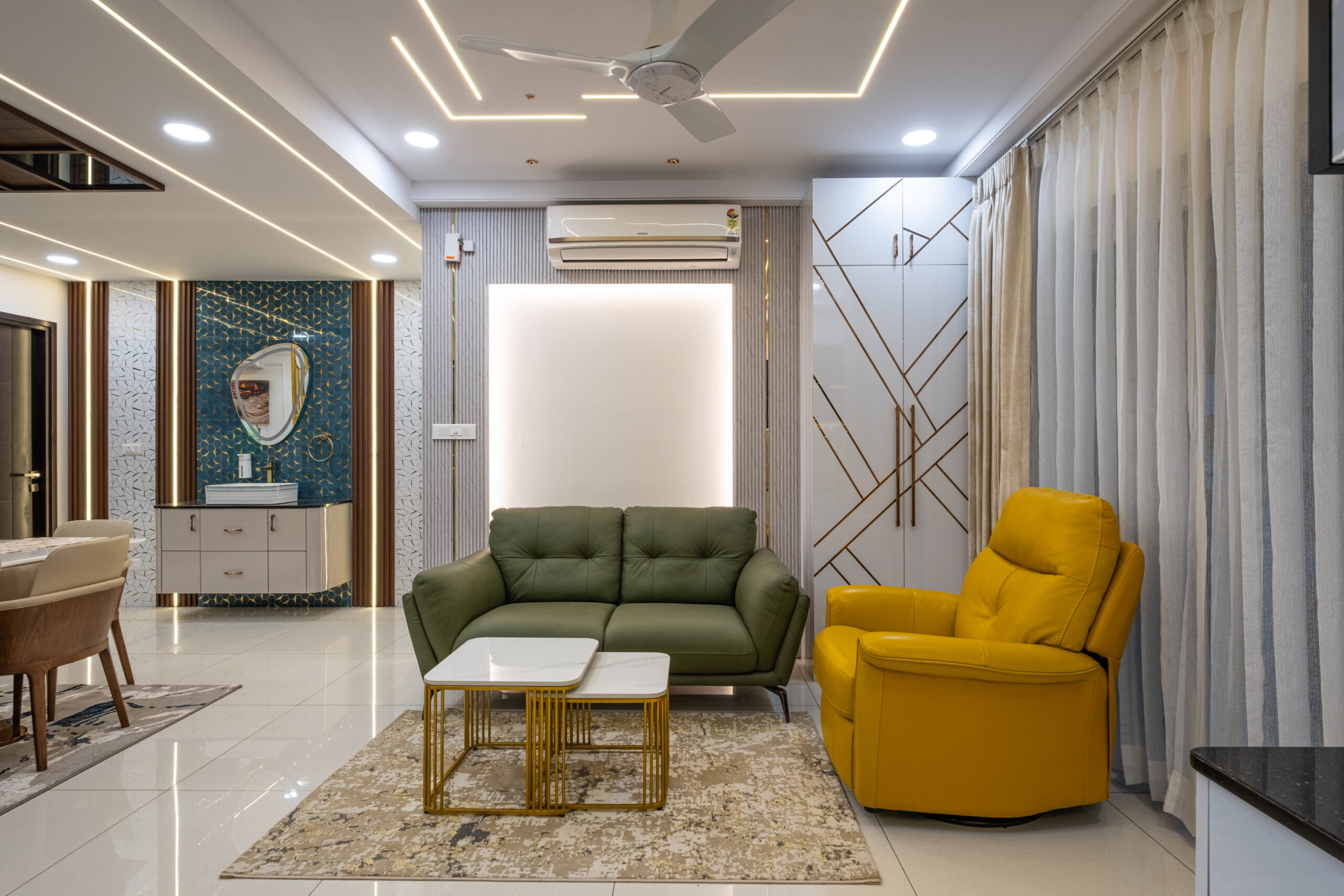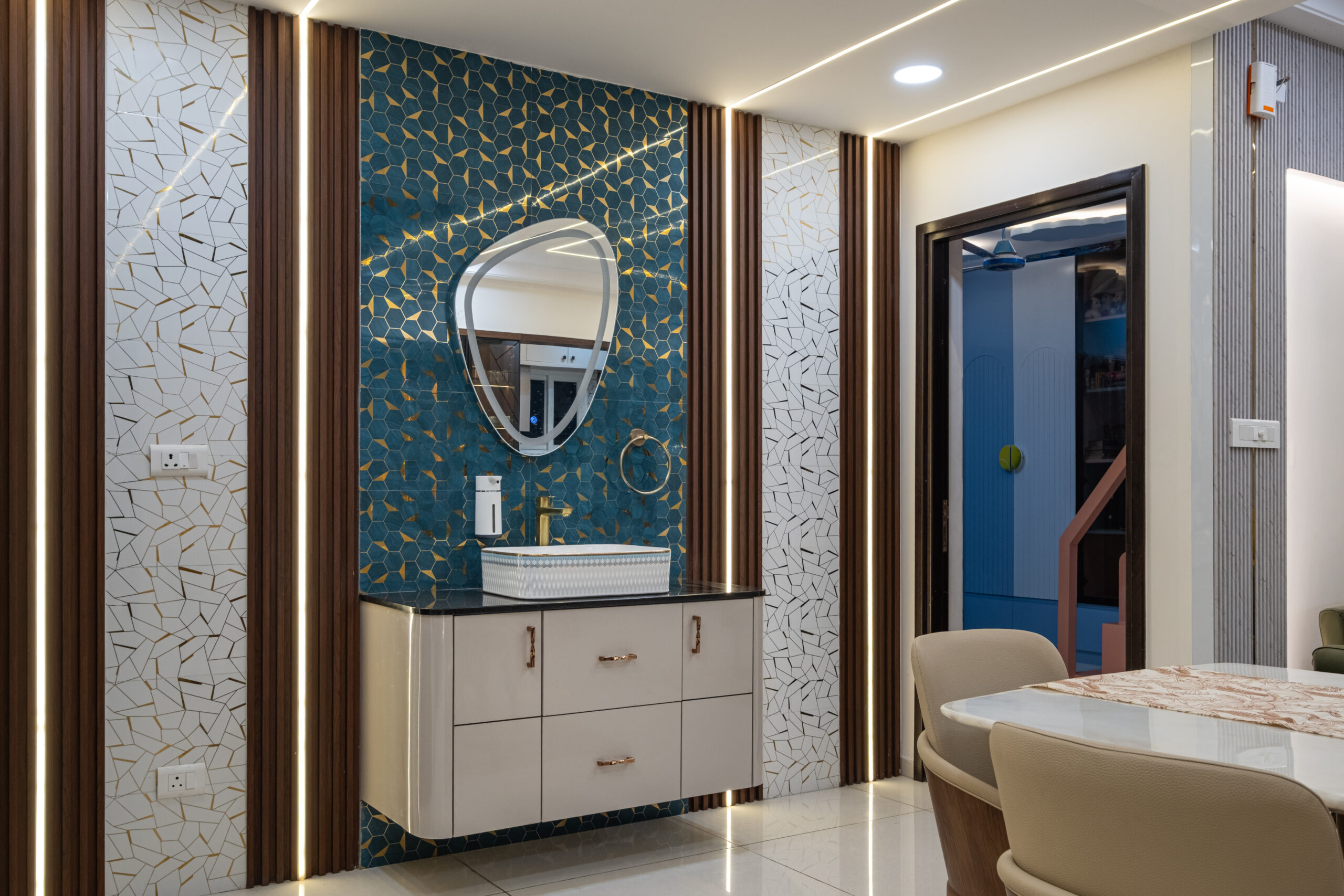SMR Vinay Boulder Woods, Bandlaguda Jagir, presents a 3BHK modern home interior design crafted with modern style and useful planning. The kitchen combines pastel cabinets with dark counters for a smart look. A striking blue wall panel in the living room is matched with soft ceiling lights for a warm vibe. White finishes and wood textures keep the home elegant, while the golden pooja unit adds tradition. This 3BHK modern home interior design makes every corner practical, stylish, and family-friendly.
