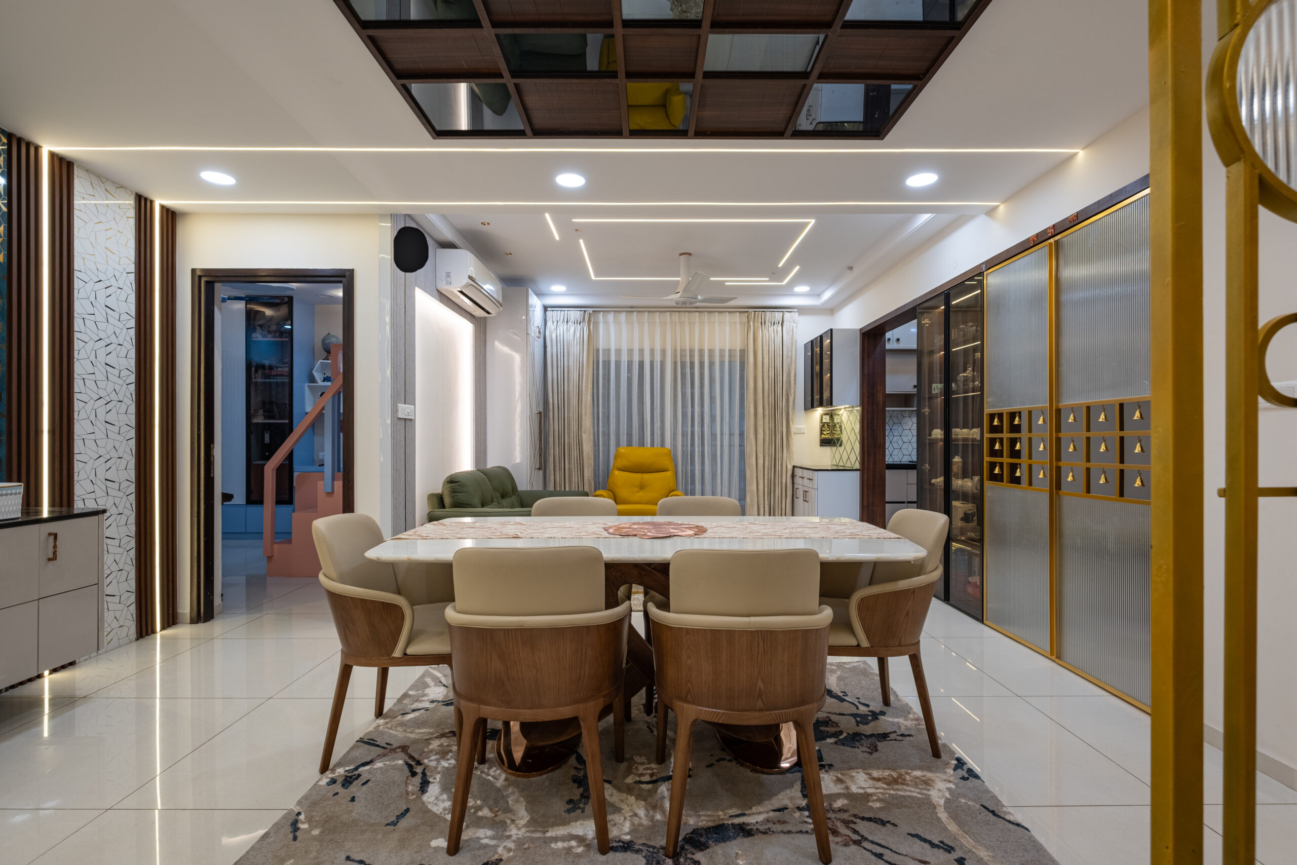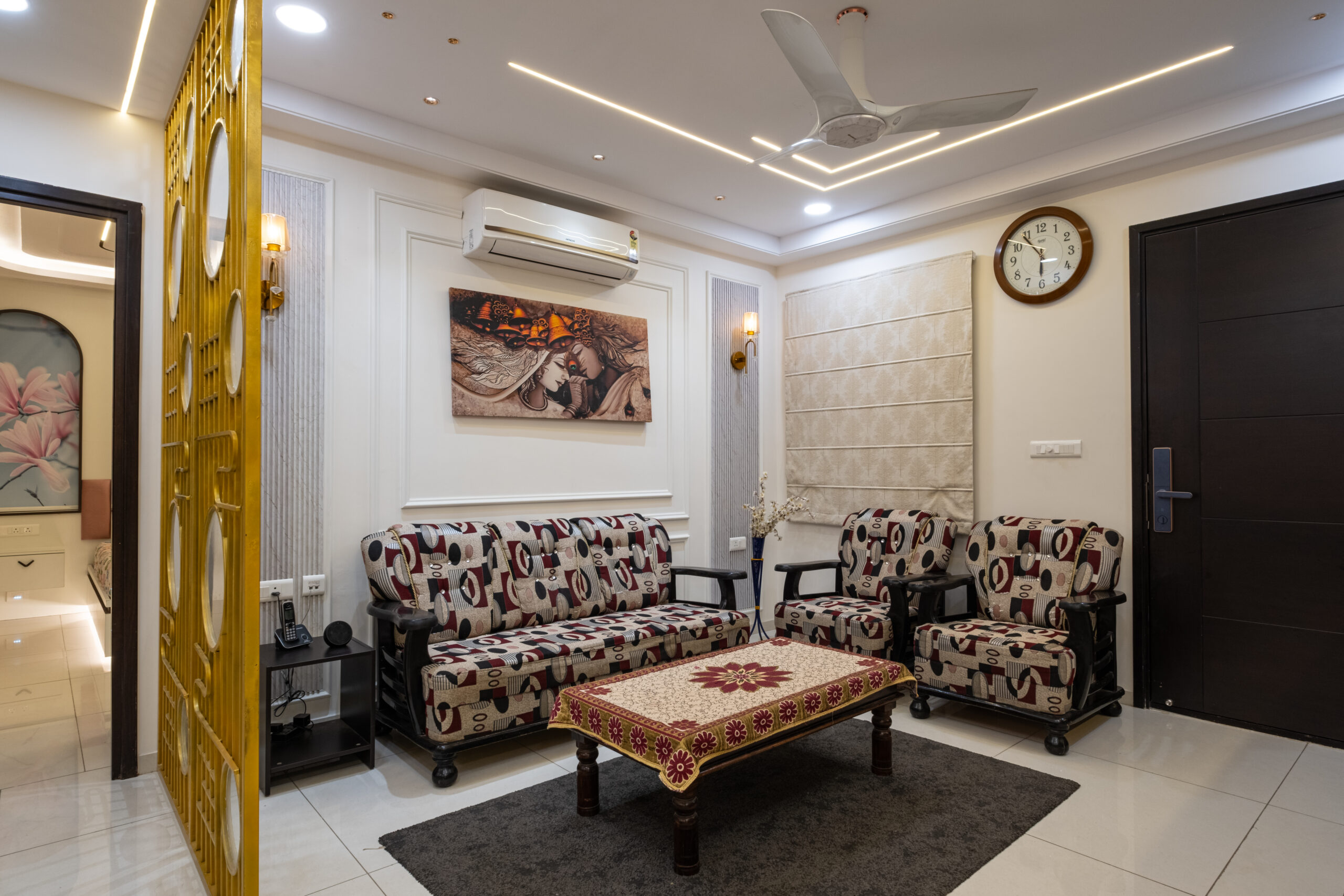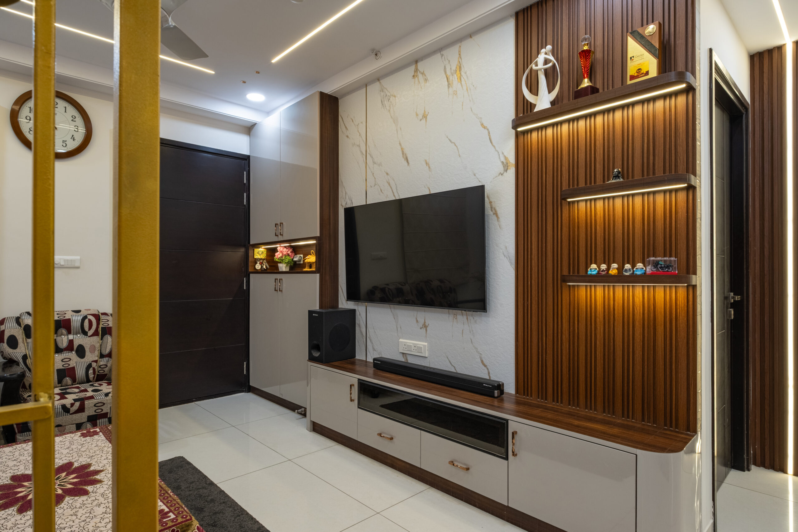 SMR Vinay Boulder Woods, Bandlaguda Jagir, presents a 3BHK modern home interior design crafted with modern style and useful planning. The kitchen combines pastel cabinets with dark counters for a smart look. A striking blue wall panel in the living room is matched with soft ceiling lights for a warm vibe. White finishes and wood textures keep the home elegant, while the golden pooja unit adds tradition. This 3BHK modern home interior design makes every corner practical, stylish, and family-friendly.
