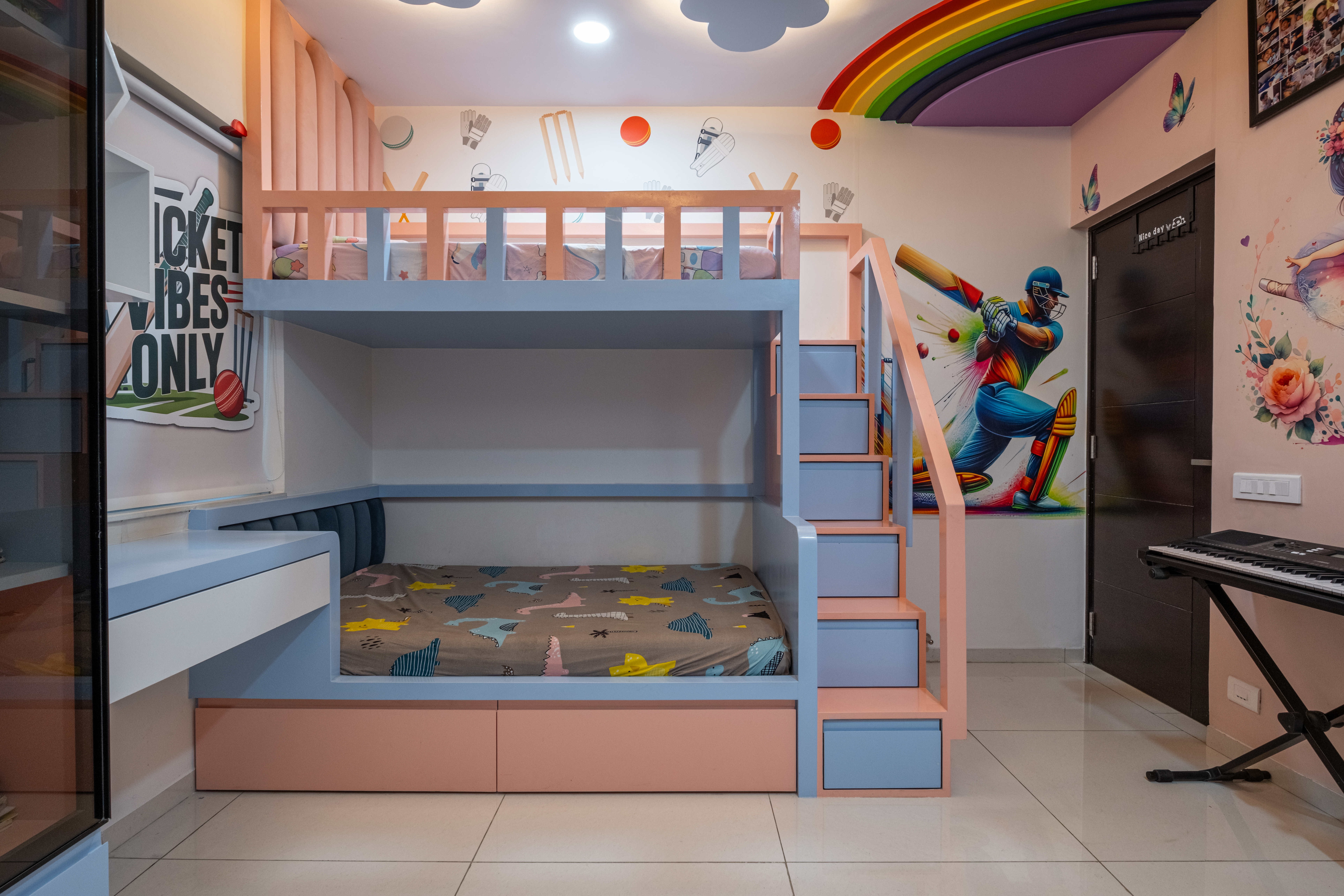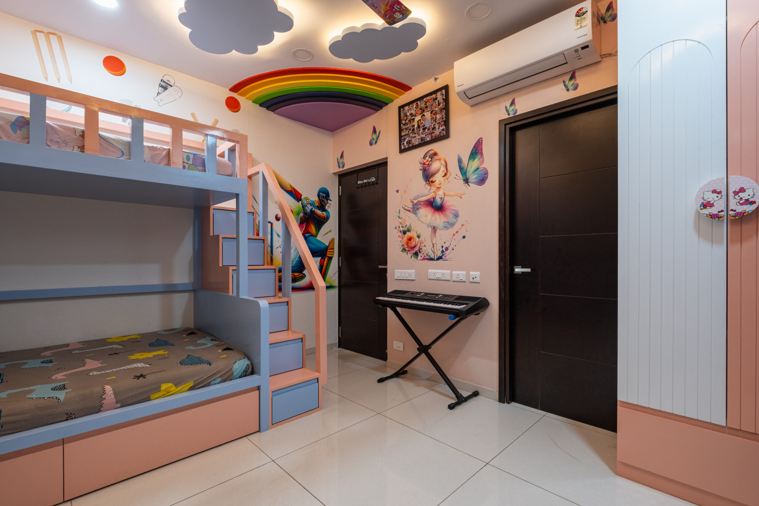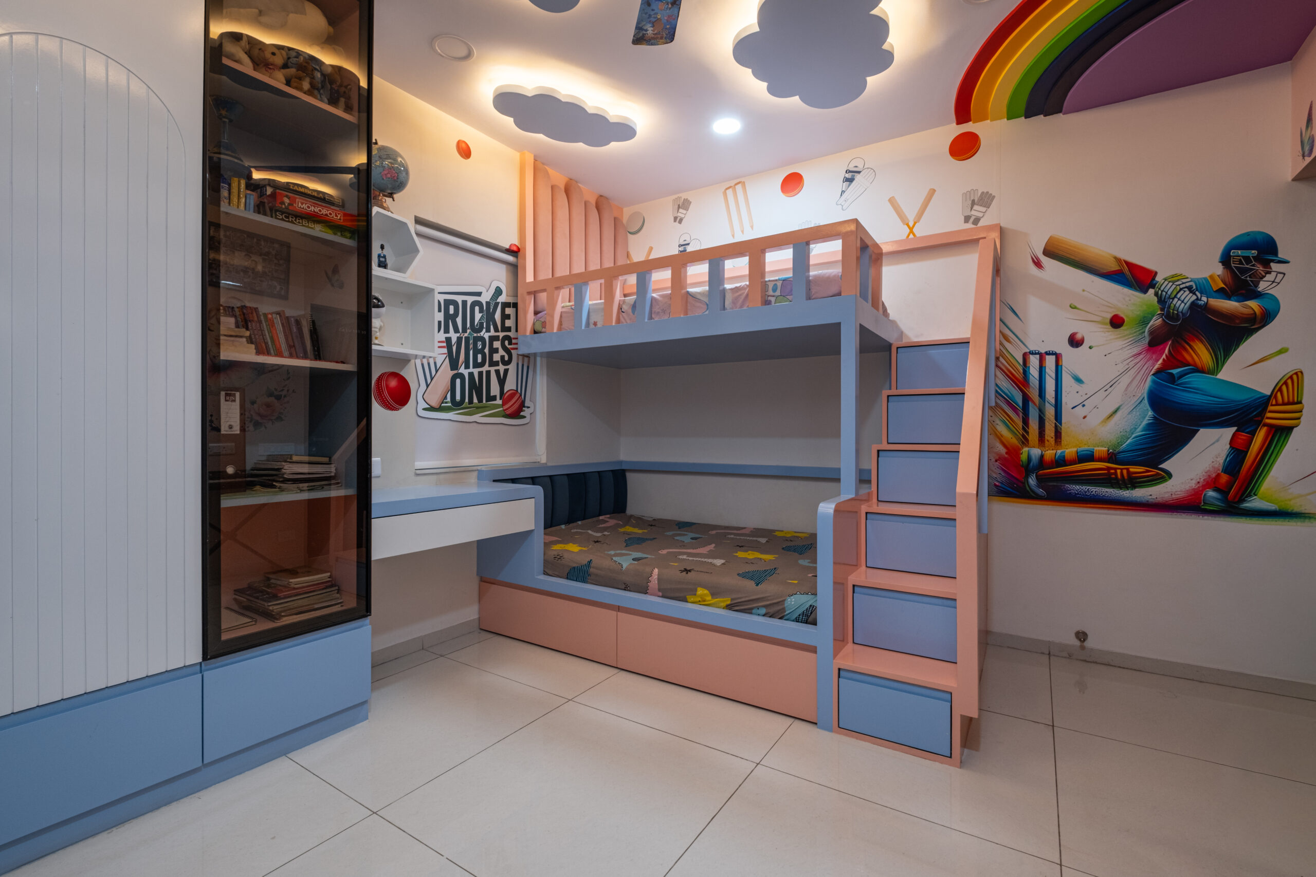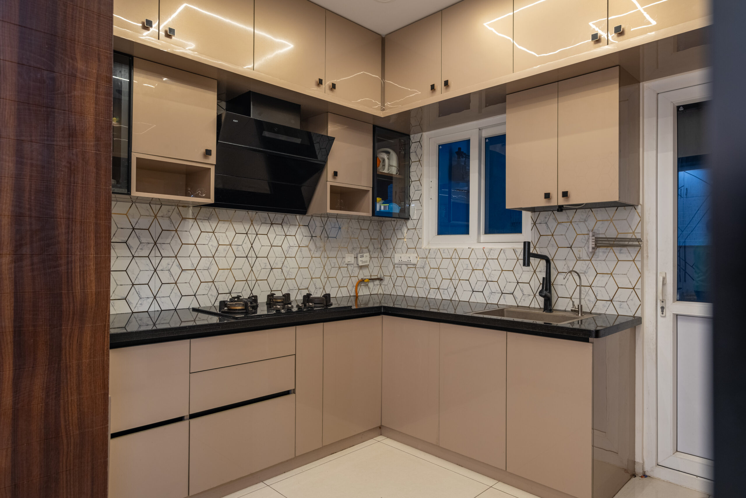 SMR Vinay Boulder Woods, Bandlaguda Jagir, presents a 3BHK modern home interior design crafted with modern style and useful planning. The kitchen combines pastel cabinets with dark counters for a smart look. A striking blue wall panel in the living room is matched with soft ceiling lights for a warm vibe. White finishes and wood textures keep the home elegant, while the golden pooja unit adds tradition. This 3BHK modern home interior design makes every corner practical, stylish, and family-friendly.