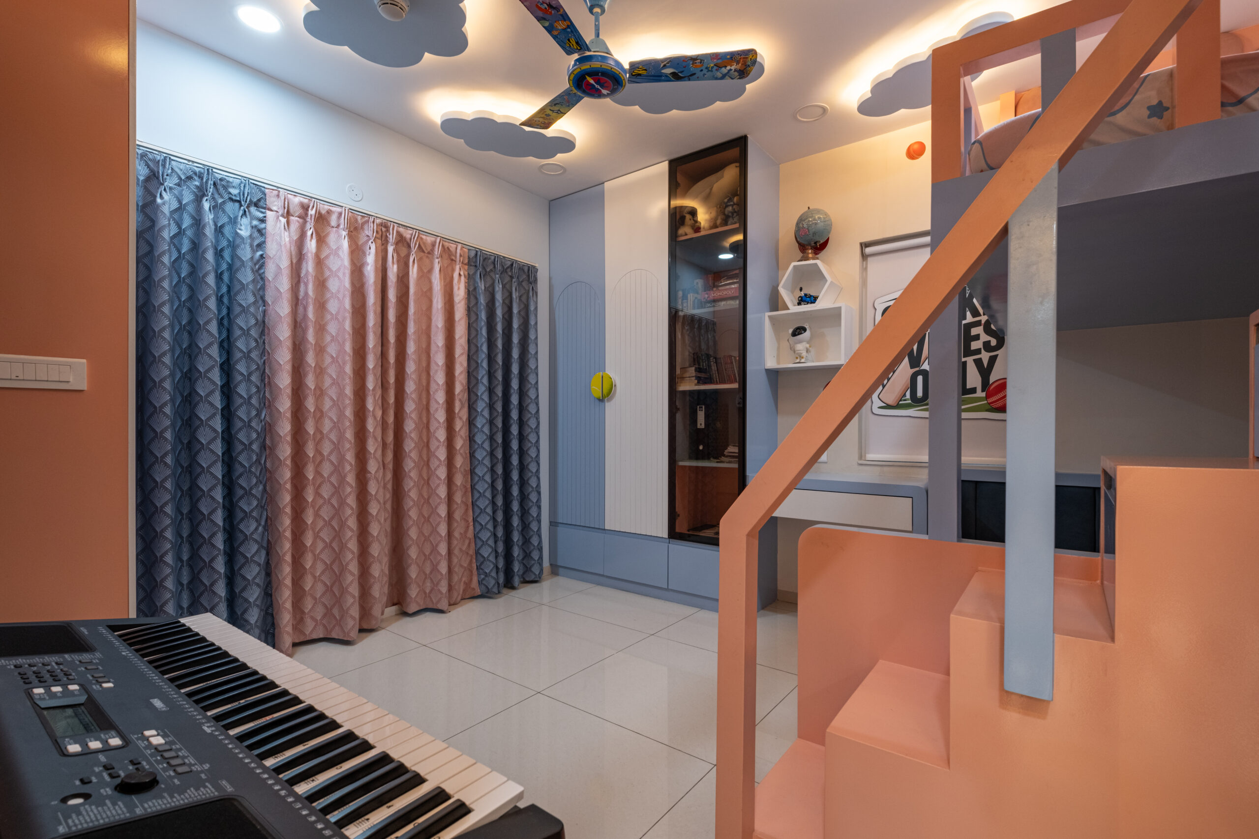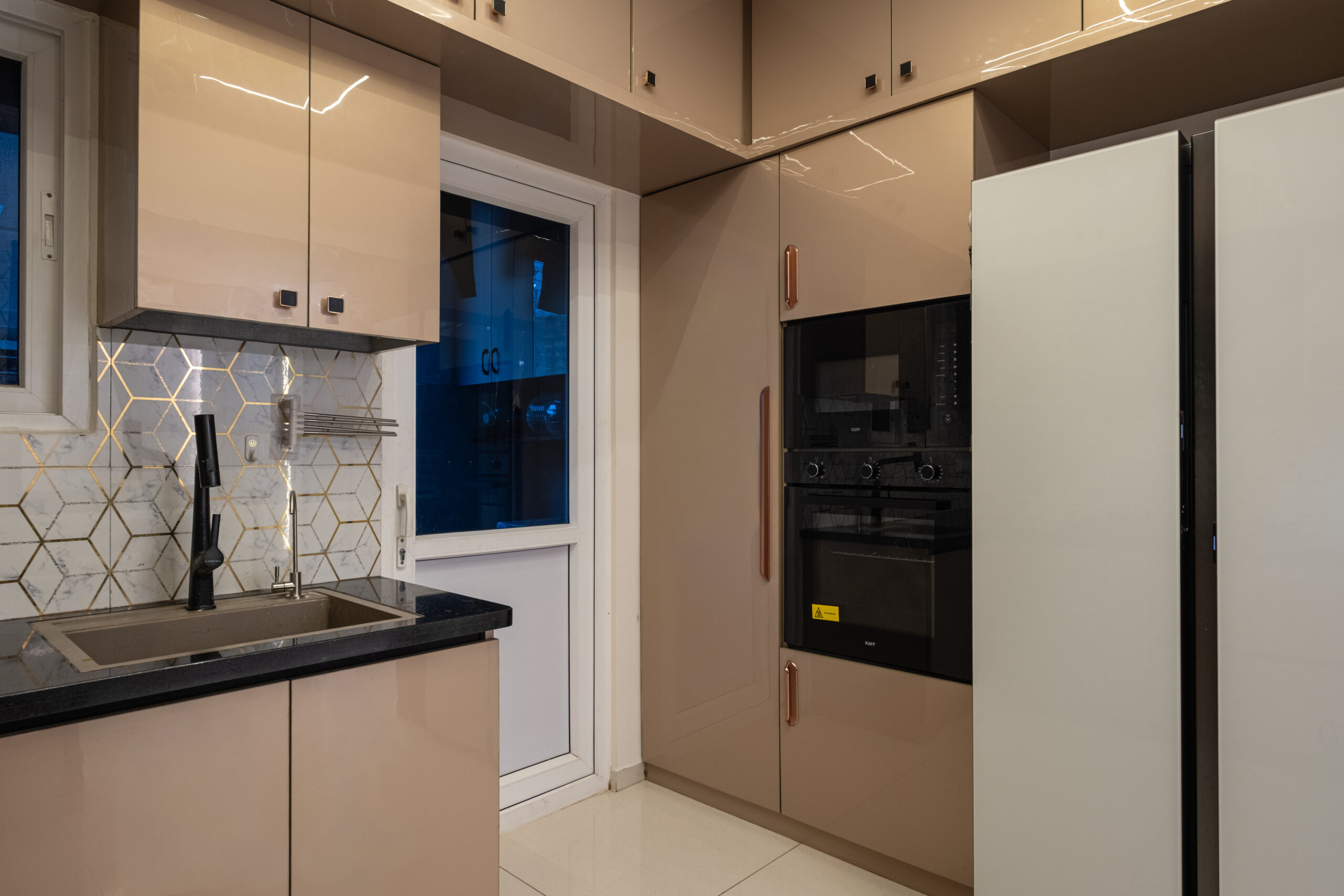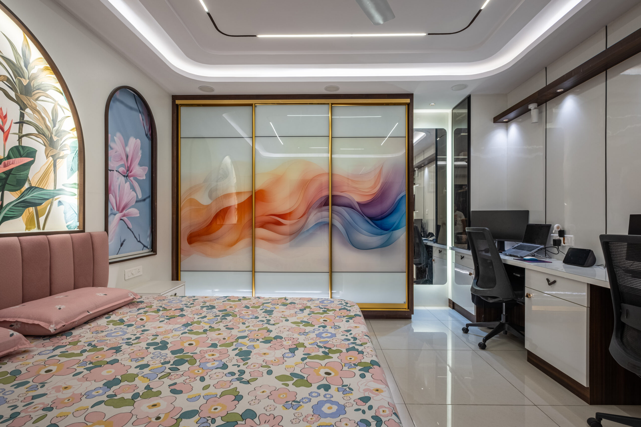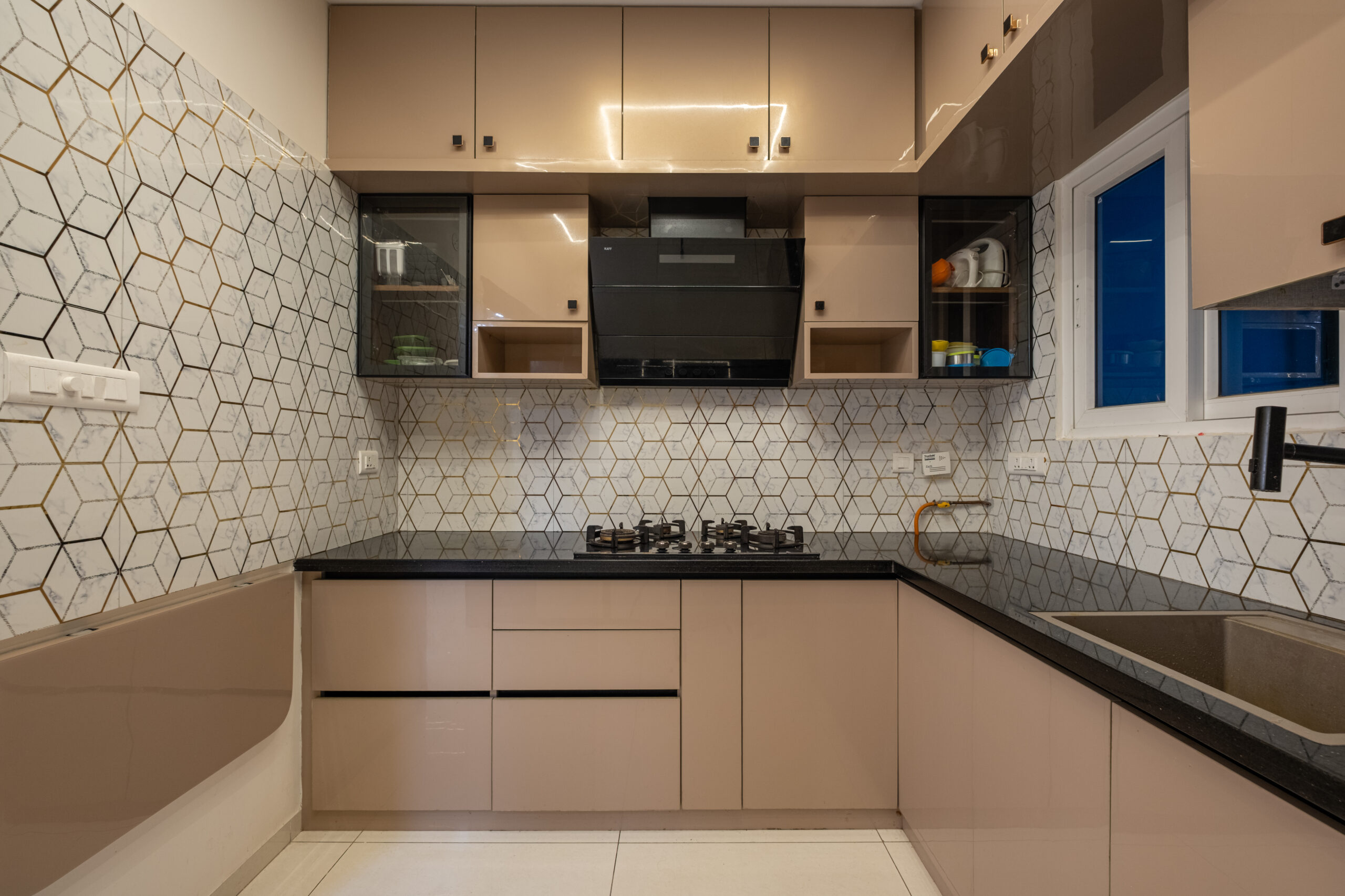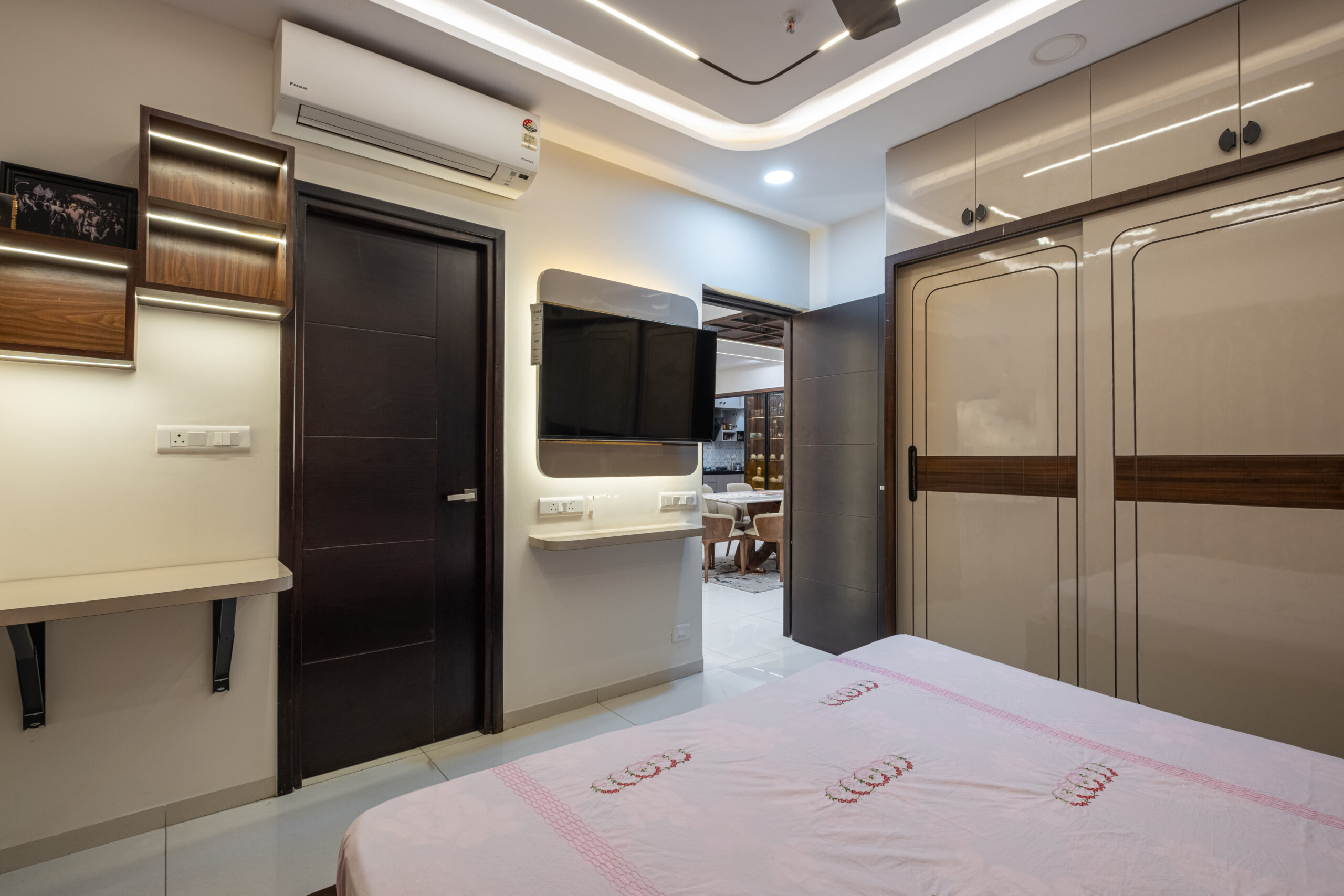 SMR Vinay Boulder Woods, Bandlaguda Jagir, presents a 3BHK modern home interior design crafted with modern style and useful planning. The kitchen combines pastel cabinets with dark counters for a smart look. A striking blue wall panel in the living room is matched with soft ceiling lights for a warm vibe. White finishes and wood textures keep the home elegant, while the golden pooja unit adds tradition. This 3BHK modern home interior design makes every corner practical, stylish, and family-friendly.